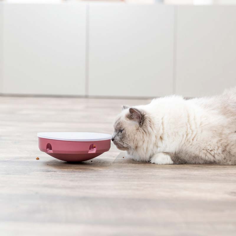 Placez ses récompenses près des trous de sortie et posez le bol au sol. Puis faites-le basculer pour que les premières friandises s’échappent. Votre matou comprendra vite.